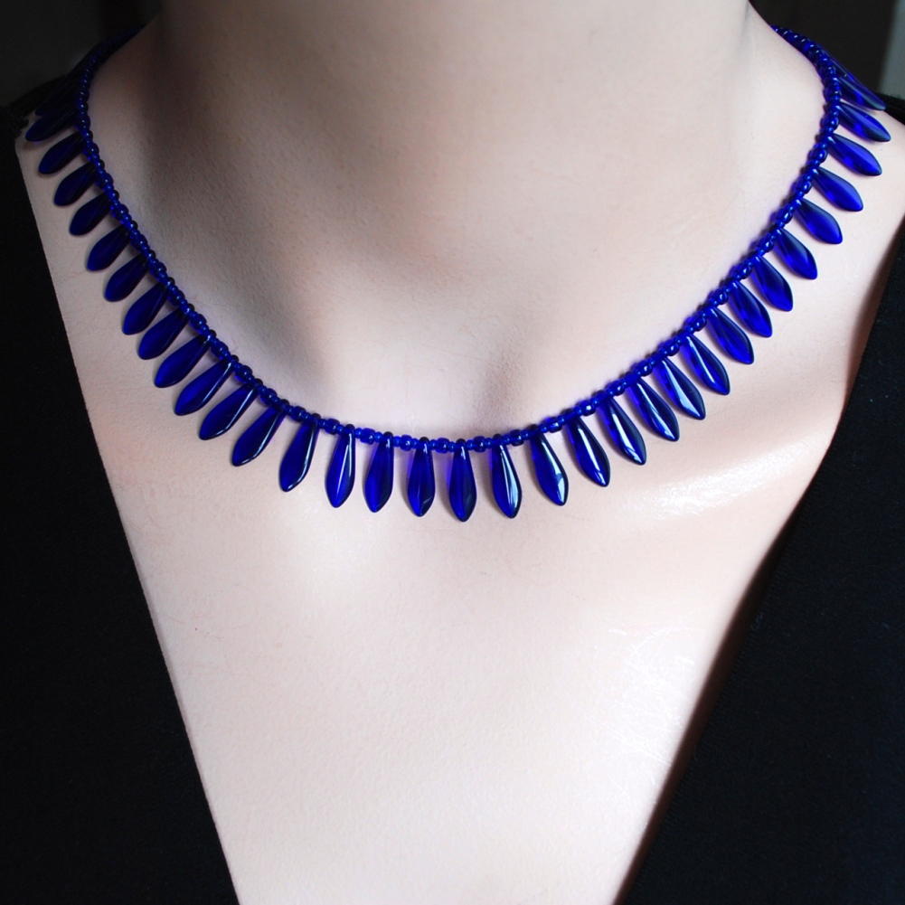 It is very light-weight, made of cobolt blue pressed glass daggers from the Czech Republic and two sizes of cobolt blue seed beads.